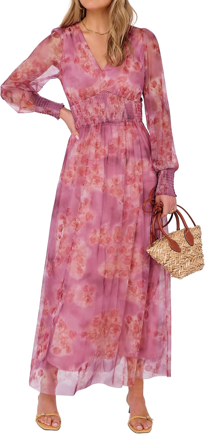 Women's Floral Maxi Dress 2025 Fall V Neck Puff Long Sleeve Flowy Casual Wedding Guest Tee Party Tulle Dresses