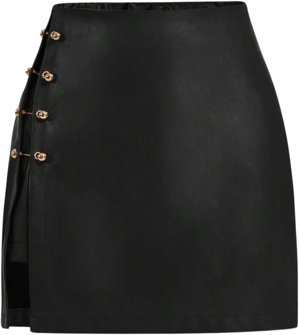 • Women's Side Slit Metallic Trim High Waisted Faux Leather Short Skirts